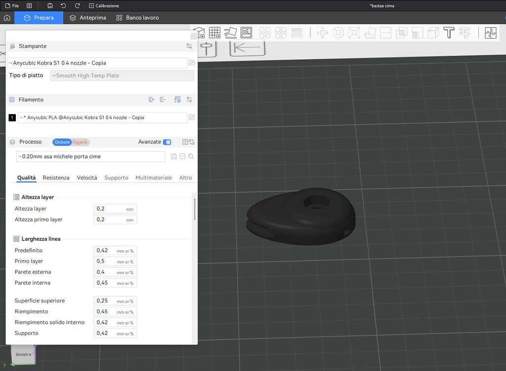 Lo slicer ci permette di settare diversi parametri che andranno a determinare la resistenza e la qualità della stampa. Si può decidere il numero di strati esterni e spessore degli ultimi, il tipo di riempimento ed altri valori di resistenza. Il software ci consente anche di intraprendere una maggiore personalizzazione del pezzo aggiungendo, per esempio, delle scritte in rilievo o in negativo. Alcuni settaggi, oltre che essere specifici del pezzo, sono legati al tipo di materiale che si andrà a stampare. Taluni infatti richiedono particolare attenzione alle velocità di stampa ed al raffreddamento mediante ventole. Se non impostati correttamente potremmo andar incontro ad una deformazione del pezzo o ad un drastico deficit di resistenza meccanica, per non menzionare poi l’aspetto estetico.